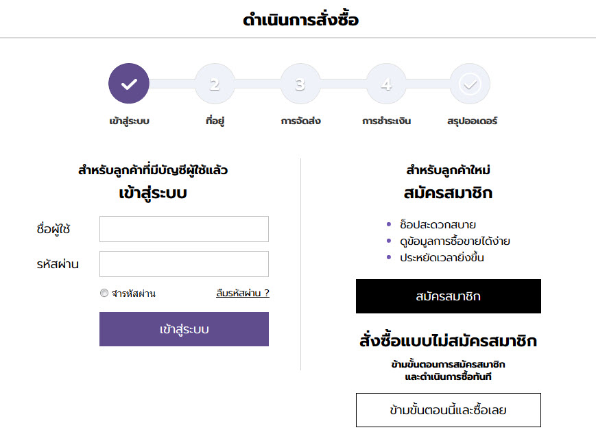 3. ในกรณีที่กดปุ่ม ชำระเงิน ระบบจะนำท่านเข้าสู่หน้า เข้าสู่ระบบ ซึ่งสามารถกรอกชื่อผู้ใช้และรหัสผ่านสำหรับท่านที่เป็นสมาชิกแล้ว หรือ สมัครสมาชิกใหม่ หรือ เลือกสั่งซื้อสินค้าโดยไม่สมัครสมาชิก