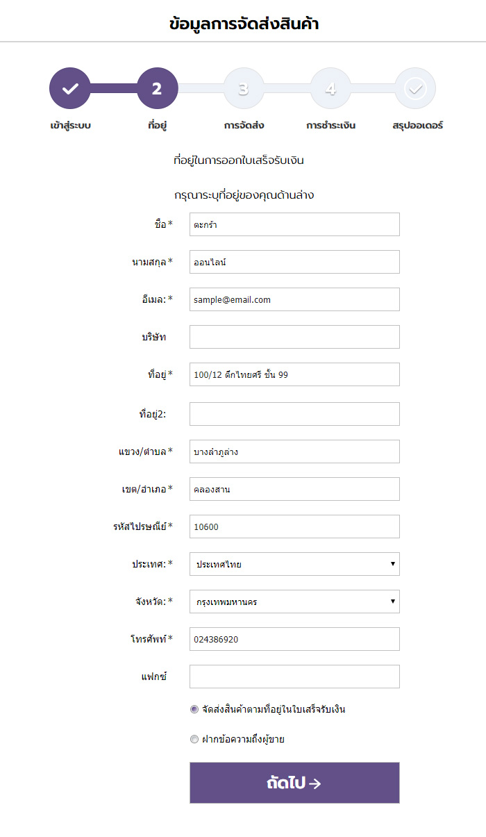 4. หากท่านเข้าสู่ระบบโดยใช้รหัสผู้ใช้งาน หรือสั่งซื้อโดยไม่สมัครสมาชิก ระบบจะแสดงข้อมูลการจัดส่งสินค้า ให้ท่านกรอกชื่อที่อยู่สำหรับติดต่อ และ ชื่อที่อยู่สำหรับจัดส่ง จากนั้นกด ถัดไป