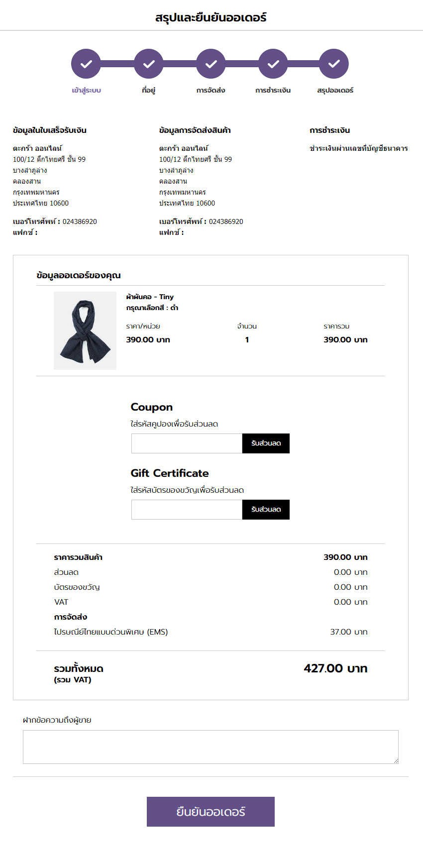 หมายเหตุ ระบบจะมีการส่งอีเมลสรุปข้อมูลการสั่งซื้อไปให้ท่านและร้านค้า เพื่อให้ทางร้านรับทราบออเดอร์และดำเนินการจัดส่งสินค้าต่อไป
